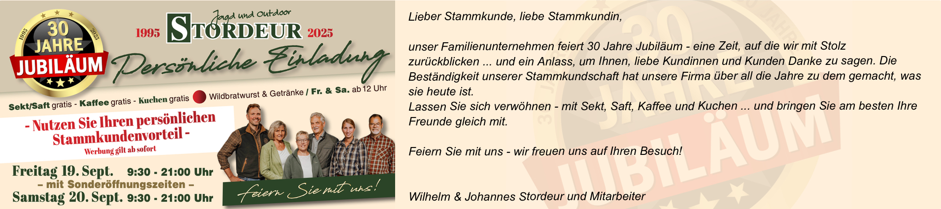 Fachberatung - Übergrößen bis 15XL - Maßanfertigung - Vereinsausrüstung - Änderungsschneiderei - Geld zurück Garantie - Bestellservice - Geschenkgutscheine - Kaffeebar - Aktionsflächen - freundliche Bedienung - Erlebniseinkauf - kostenlose Parkplätze - Meisterwerkstatt für Waffen & Optik - An- & Verkauf von Neu- & Gebrauchtwaffen - 24 Std. Onlineshopping www.stordeur.de